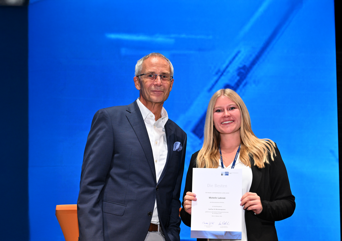 Unsere ehemalige Auszubildende Michelle Lubinski hat ihre IHK-Ausbildung zur Kauffrau für Büromanagement an der IHK Köln mit der Note „sehr gut“ abgeschlossen – und gehört damit zu den 363 Jahrgangsbesten!